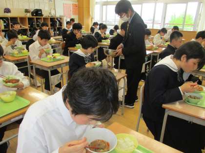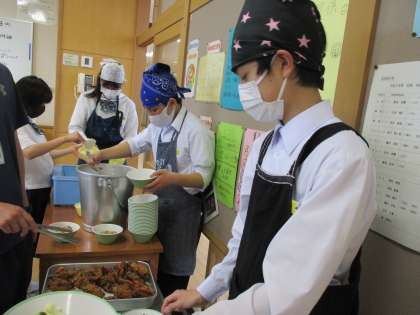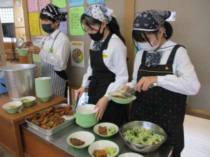 給食の準備を手際よく行い、残食なく食べています。
