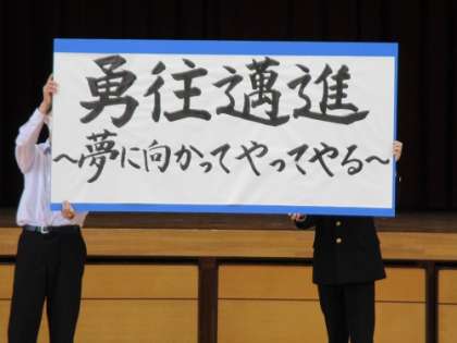 「勇往邁進」〜夢に向かってやってやる〜の言葉は皆さんの意気込みが感じられる、学年目標です。この言葉通り、修学旅行では次の四つを目標にしてください。一つ目は、学校で学べないことを自分の目で見て学んでくること。二つ目は、絆を深めること。三つ目は、最高の思い出をつくること。四つ目は全員が元気に帰ってくること。