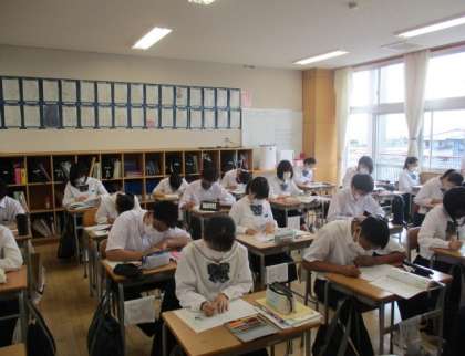 国語の授業「握手」で、ルロイ修道士のことについてプリントにまとめています。