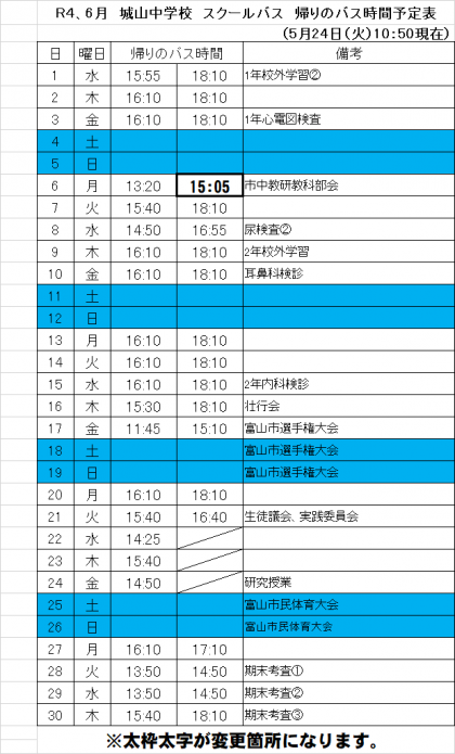6日(月)の2便が 14:40 → 15:05 に変更となります。