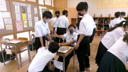 1年生は、自分たちが暮らす地域ならではのモノやコトをモチーフにした文様づくりをします!1年3組は、この地域らしいものって何だろう?と意見交換をしました!1年1組は、Chromebookを使って、アイディアスケッチをしました!