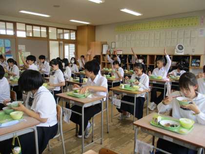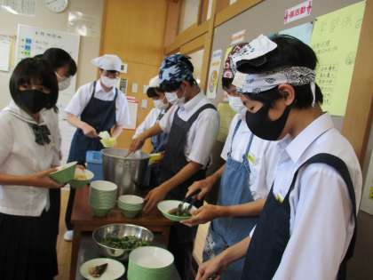 給食当番が身支度を整えて、手際よく盛り付けています。残食なく、美味しくいただいています。