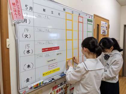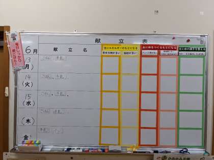 放課後、献立黒板をリニューアルしました。栄養素を意識して、カラフルになりました。