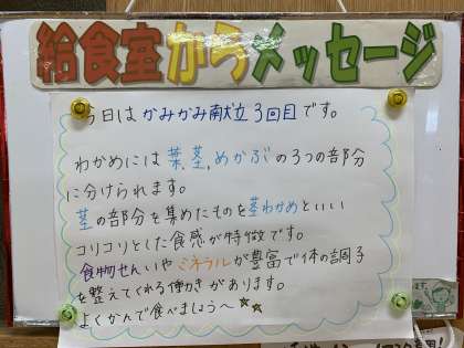 今月3回目のかみかみ献立でした。かみかみするのは、茎わかめでしたが、みそ煮込みの量が多く、かみかみの数が増えました。