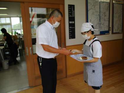本日のメニューはクレープです。生クリームやフルーツをトッピングした豪華なクレープができました。みんな笑顔で完食しました。校長先生にも食べていただきました。