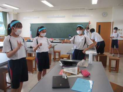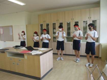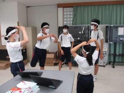 各団の団リーダーが、団演技について熱心に話し合っています。実際に動いてみながら、動きや構成を考えています。