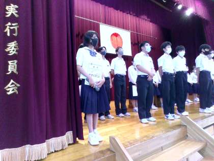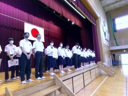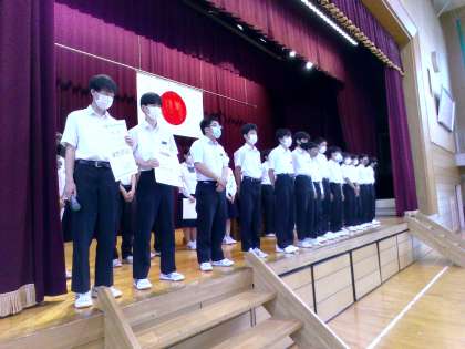 男子バレーボール、水泳部、吹奏楽部の受賞報告の様子です。