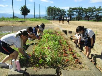今日は、ボランティアの生徒による地域清掃・千里駅清掃、学校美化活動が行われ、暑い中、1年生から3年生まで約50名が参加しました。