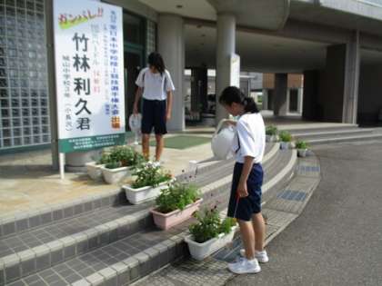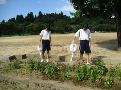ボランティア委員が花の水やりをしています。今日の当番ではない生徒も手伝ってくれました。ありがとう!!