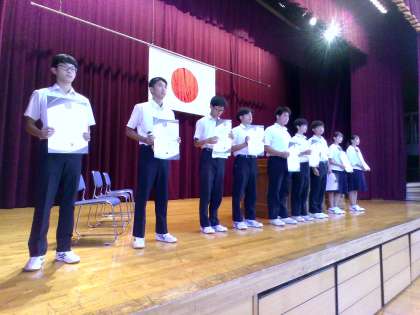 陸上競技部の北信越大会、通信陸上競技大会、県民体育大会の受賞報告の様子です。みなさん、おめでとうございます。