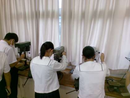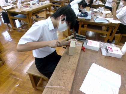 技術では、オルゴール人形の製作をしています。今日は、台枠の加工を行いました。