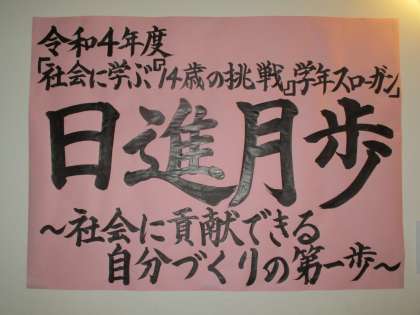 「社会に学ぶ『14歳の挑戦』」実行委員が、スローガンを掲示したり、お世話になる事業所を地図上にまとめたりしました。今月末に向けて、着々と準備が進んでいます。