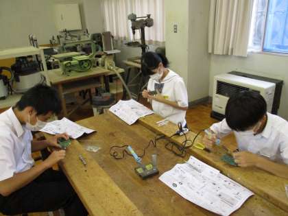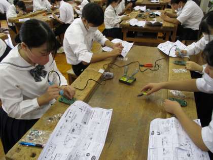 ダイナモラジオの製作をしています。安全面に留意し、電子部品の取り付けを行っています。