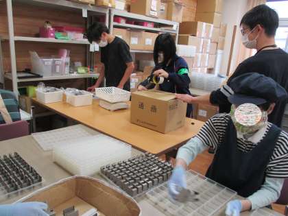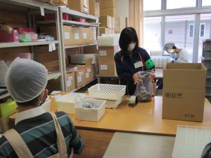 利用者さんが袋詰めした品物の重さを確認しながら、段ポールに入れる作業をしていました。