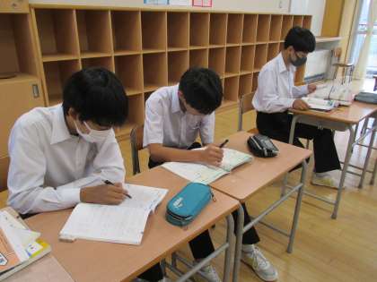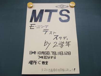 2学年では、学年生徒会による「MTS〜モーニング テスト スタディ」という企画がスタートしました。中間考査に向けて、初日から、たくさんの生徒が学習に励んでいました。