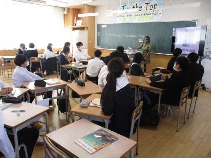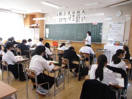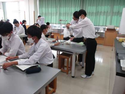 写真上 滑車を使って仕事量を図る実験中(3年1組)