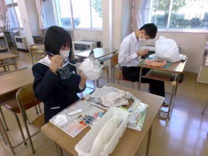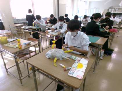 1年1組は仮面制作をしています。色塗りに突入した生徒がいます!順調です!