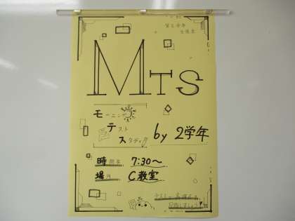 2学年生徒会が主催している「MTS(モーニング テスト スタディ)」で、自主学習に取り組んでいました。来週の中教研学力調査に向けて、朝の時間を有効に使いましょう。