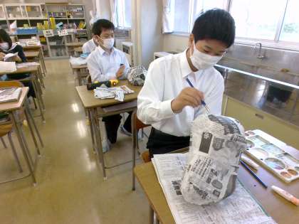 1年1組は仮面制作で色塗りをしています!完成まであと2時間!