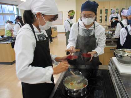 食材を切る生徒たちの顔は真剣そのものです。全員で協力し、短い時間で手際よく進め、熱々の豚汁を作ることができました。
