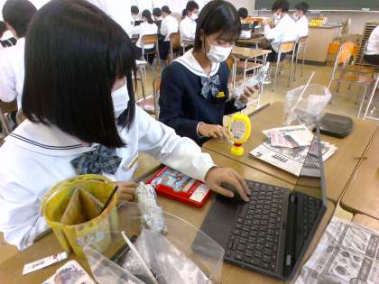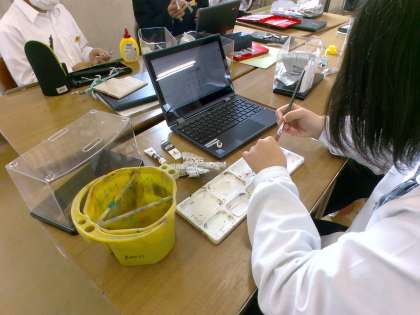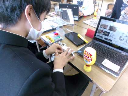 2年3組は、新聞紙彫刻の色塗りに入りました!画像で色を確認しています!