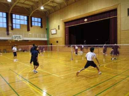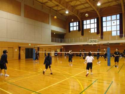 体育館では、バレーボール部とバドミントン部が元気に活動していました。