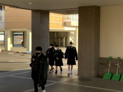 今朝は放射冷却でしょうか、玄関前の水たまりも凍っています。足下に気をつけて登校していました。