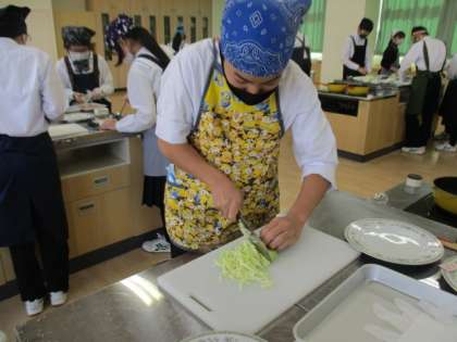今日は1年生全クラスが、豚肉のしょうが焼きの調理実習を行いました。全員がキャベツの千切りに挑戦しました。どのクラスも短い時間で手際よく進めるこたができました。今度は、家庭でぜひ作ってみてくださいね。