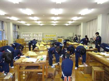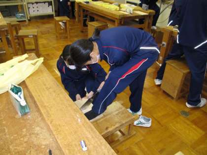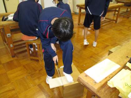 木材を使った作品製作中です。のこぎり挽きにはコツがあります。身につけることができたでしょうか?