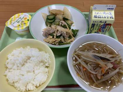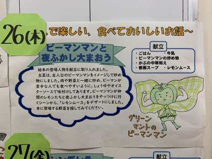 今日の給食は、「ピーマンマンと夜ふかし大まおう」から
