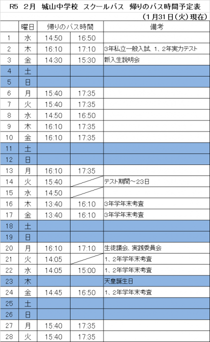 2月のスクールバスの運行予定を掲載します。変更があった場合は、改めてホームページにてお伝えします。
