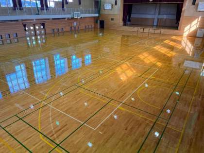 本日、専門業者による体育館のワックスがけが完了しました。