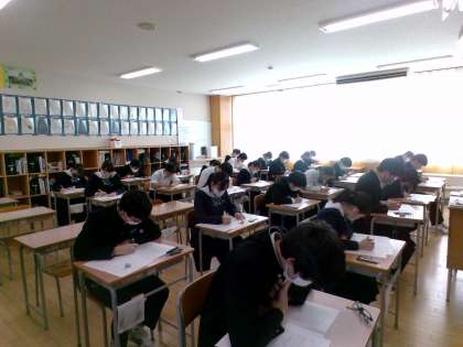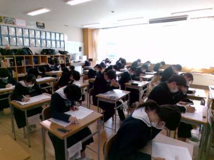 英語の確認テストに真剣に取り組んでいます。頑張れ、受検生!