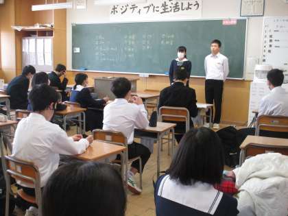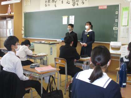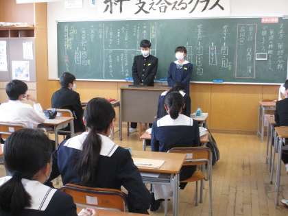 2学年生徒会や生徒会応援団の生徒から1、2年生に向けてお願いに行きました。卒業証書授与式で、素晴らしい在校生の歌となるように練習をしていきましょうと・・・。
