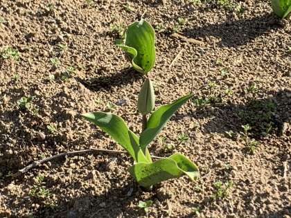 おはようございます。朝の様子です。 チューリップの花芽も伸びてきました。