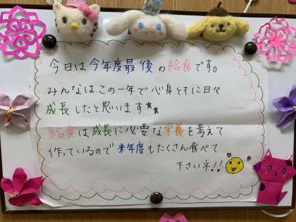本日、給食最終日でした。一年間ありがとうございました。毎日美味しいくいただき、体も大きく成長することができました。