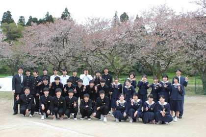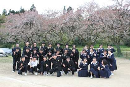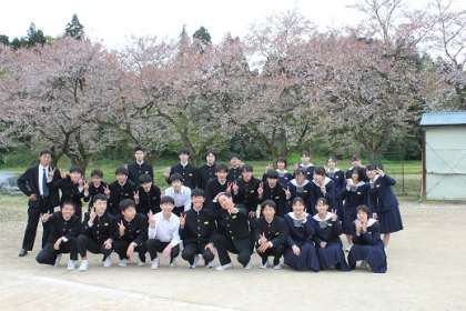 桜吹雪の中、クラスで写真撮影を行いました。一年間、よろしくお願いします。