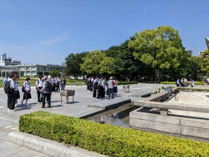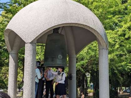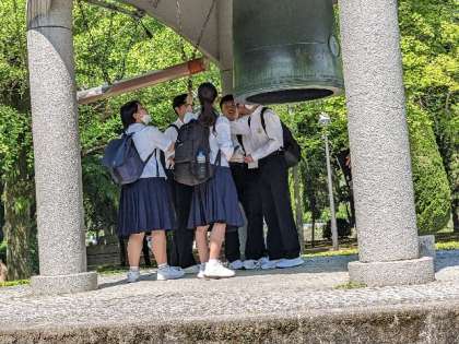 ガイドさんと碑巡りをしています。平和の鐘を皆でつきました。
