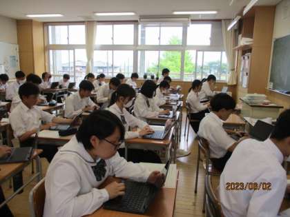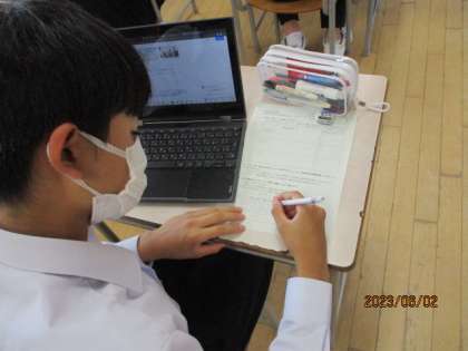 3年生の総合的な学習の時間では、各自に設定した課題について追究しています。クロムブックのスライドにまとめ始めています。