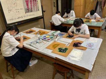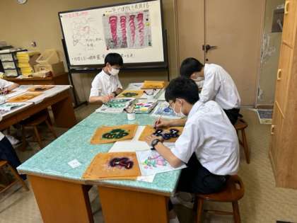 加賀友禅会館での友禅染め体験の様子です。 真剣に取り組んでいます。