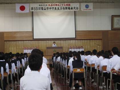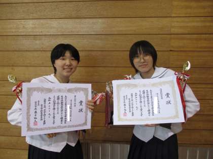「社会を明るくする運動」富山市中学生生活体験発表大会に3年生から2名の生徒が参加しました。富山市長賞と北日本新聞社長賞を受賞しました。