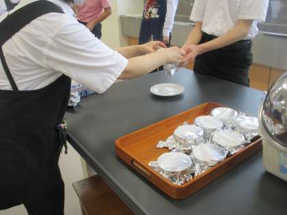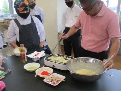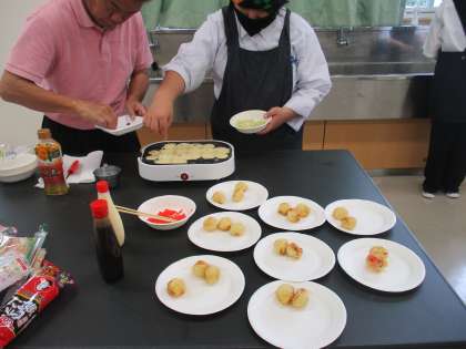 調理実習をしています。たこ焼きとプリンをつくりました。