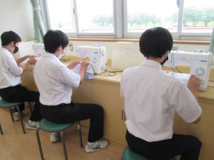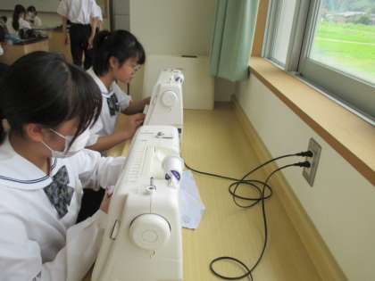 家庭科では、ミシンを使って巾着袋を製作しています。