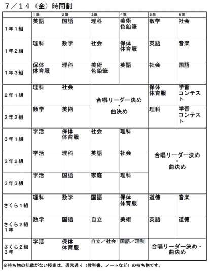 7月14日(金)の全校時間割です。教職員一同、生徒の皆さんの登校を心待ちにしています。