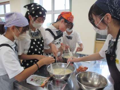 家庭部は、調理実習を行いました。3年生は、今回が最後の実習です。みんなで楽しそうに、ソーセージやハム、チーズが入った洋風たこ焼きを作りました。