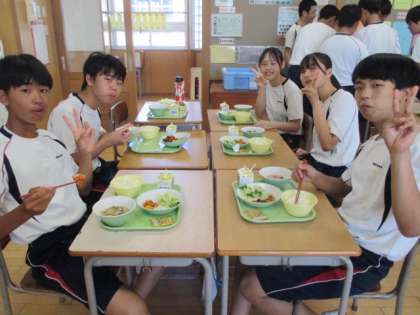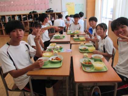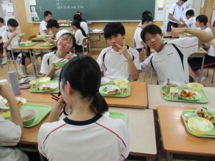 今日からおいしい給食が始まりました。どのクラスも、にっこり笑顔でおいしそうに食べていました。