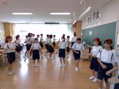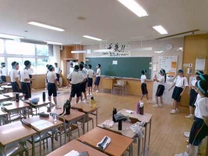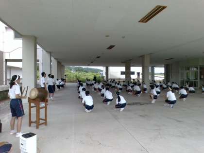 全体での団活動は、時間を絞って集中して取り組んでいます。暑さ対策のため、小グループに分けての活動です。