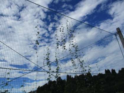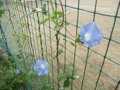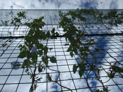 玄関前の朝顔の蔓が空に向かって伸びています。