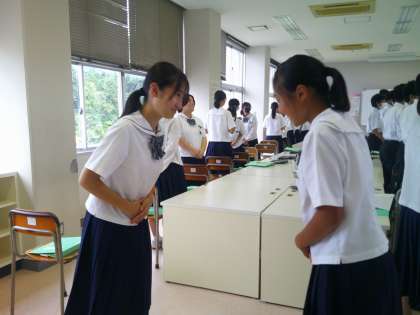 実際に挨拶やお辞儀をしながら、マナーについて学んだり、14歳の挑戦に向けての心構えを教わったりしました。