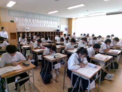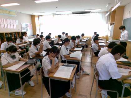 演説中のクラスの様子です。選挙公報をしっかり見ながら、演説を聞いています。